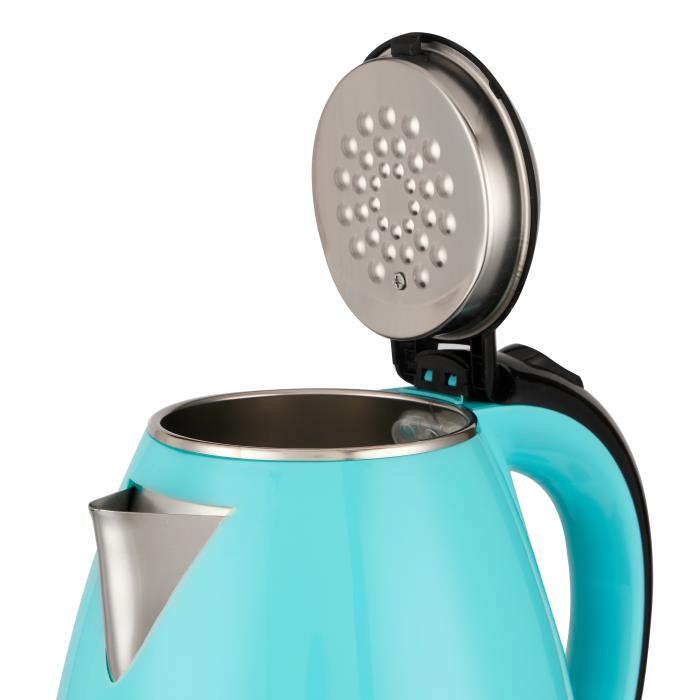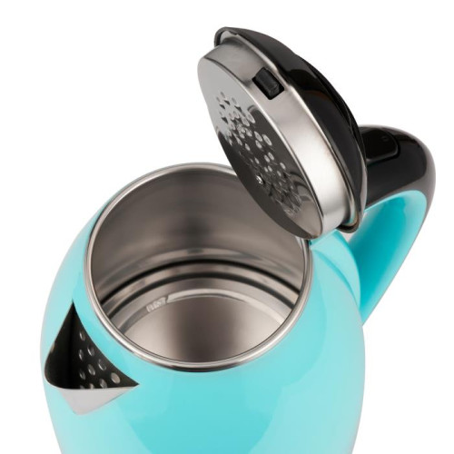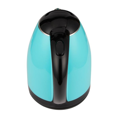 Потужність 1500 Вт, Ємність 1,8 л, Cool Touch, захист від опіків, закритий нагрів елемент з нерж сталі, поворотна база 360*, автовідключення при закипанні, автовідключення при відсутності води, індикатор включення, корпус подвійна стінка (нерж сталь покрита термостійким харчовим пластиком), колір пластика: бірюзовий. Гарантія - 1 рік.