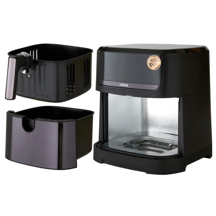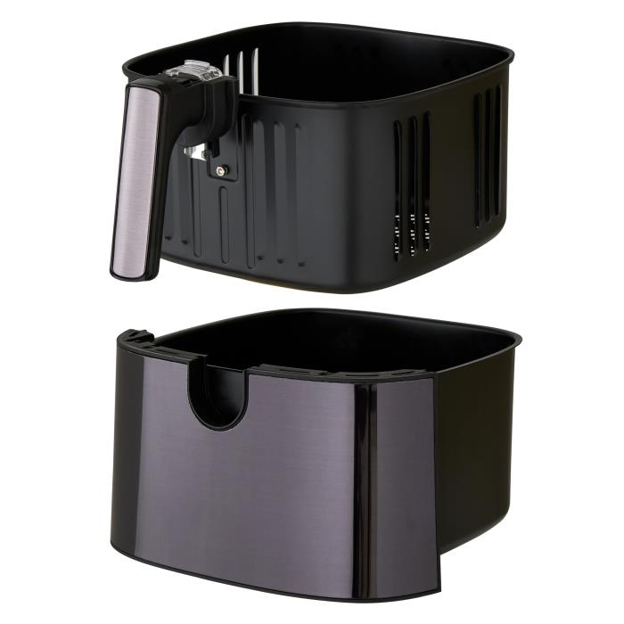 Мощность 2000 Вт, объем чаши: 9,5 л. Верхний/нижний нагрев. 11 автоматических программ: картофель фри, куриная голень, курица, рыба, стейк, пицца, маффины, овощи, картофель, размораживание и предварительный нагрев камеры. Объем корзины 8,5 л, тип управления: сенсорный.